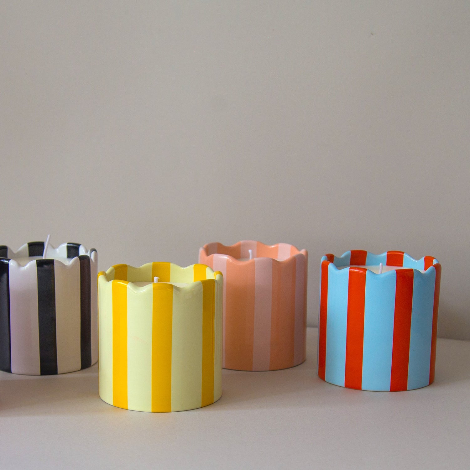 Colección vibrante en cerámica esmaltada con rayas de colores. Fresca, alegre y lúdica: ilumina, perfuma y decora con estilo.