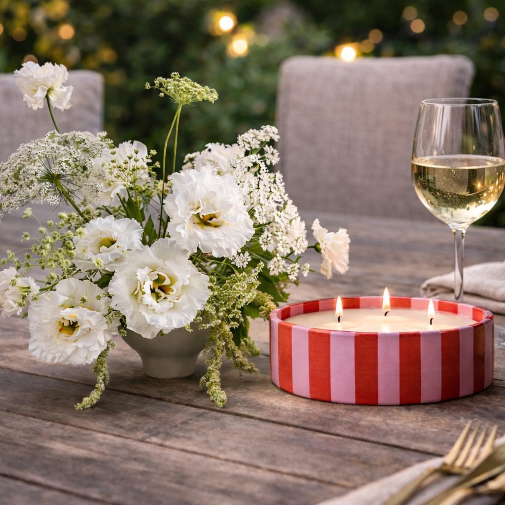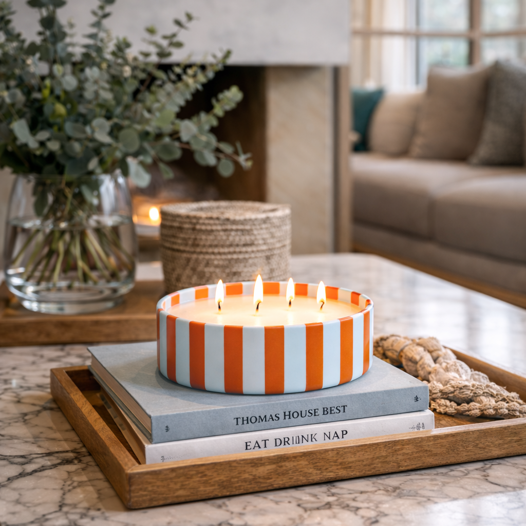 Vela decorativa en recipiente de ceramica con diseño a rayas en blanco y negro. Su cera de alta calidad y multiples mechas proporcionan una iluminación cálida y uniforme, creando un ambiente acogedor y sofisticado. Perfecta para realzar cualquier espacio con un toque de estilo y elegancia.
