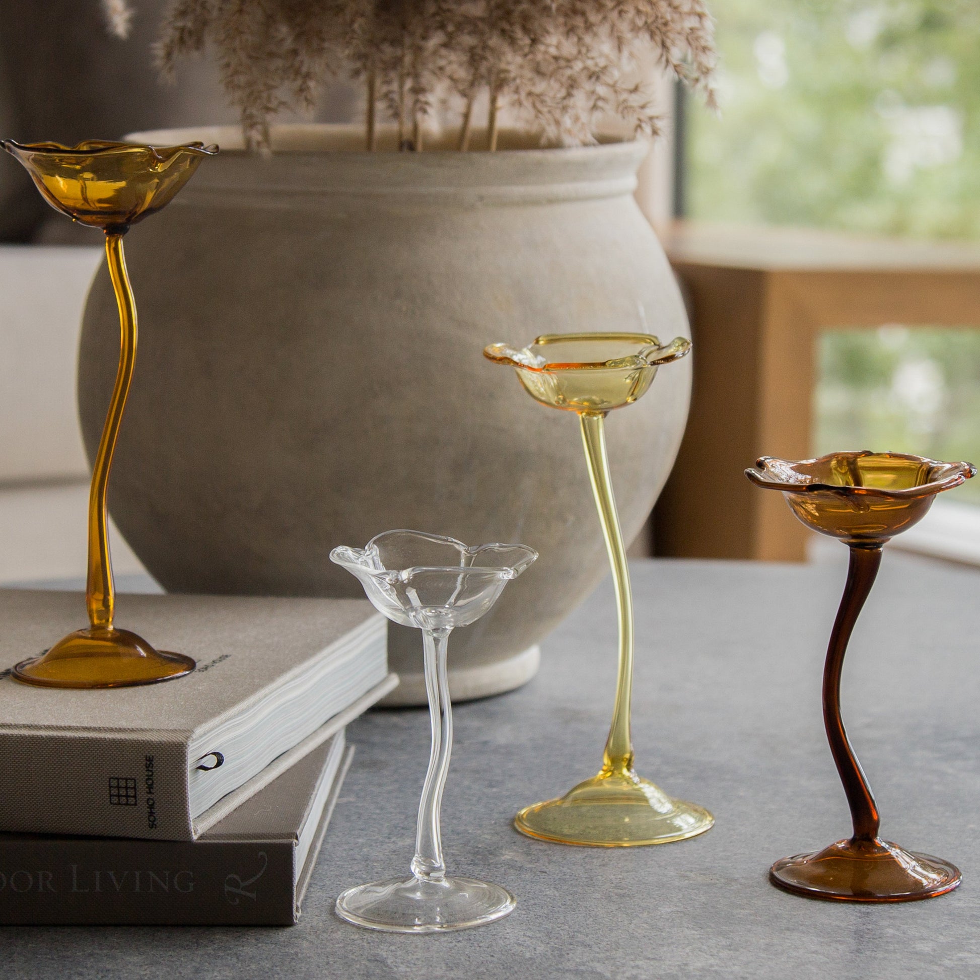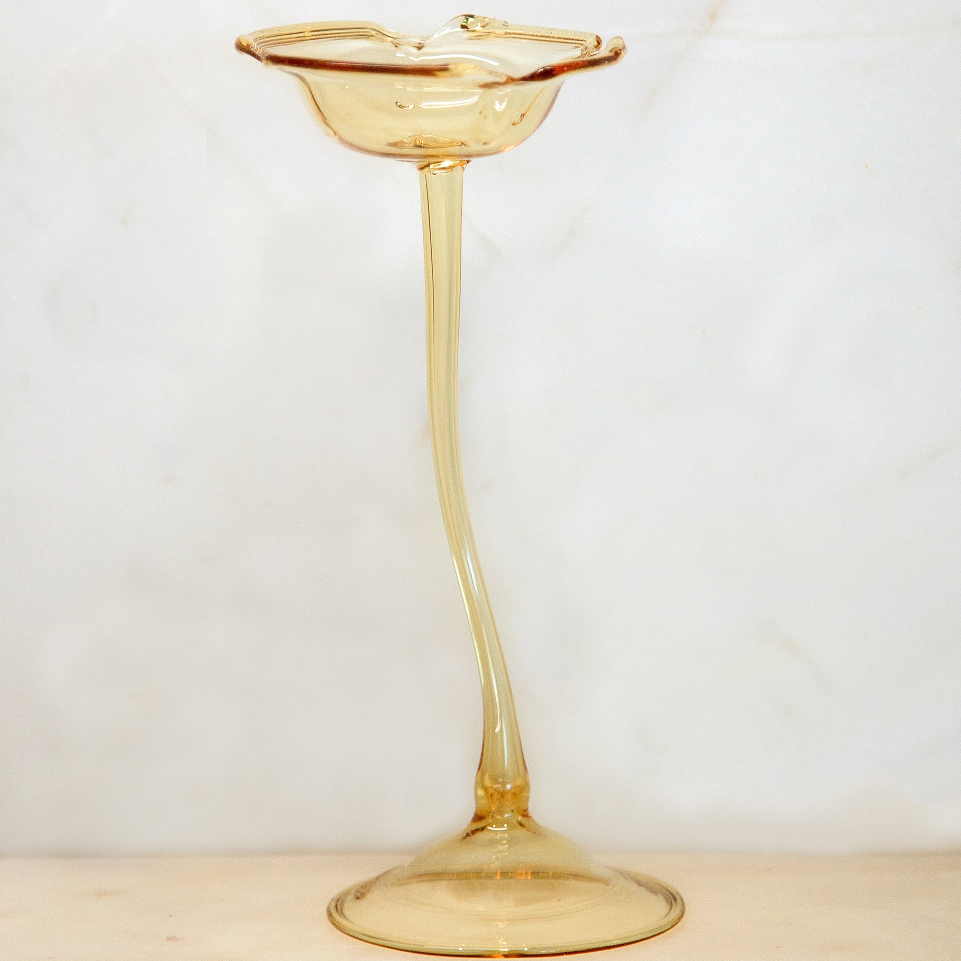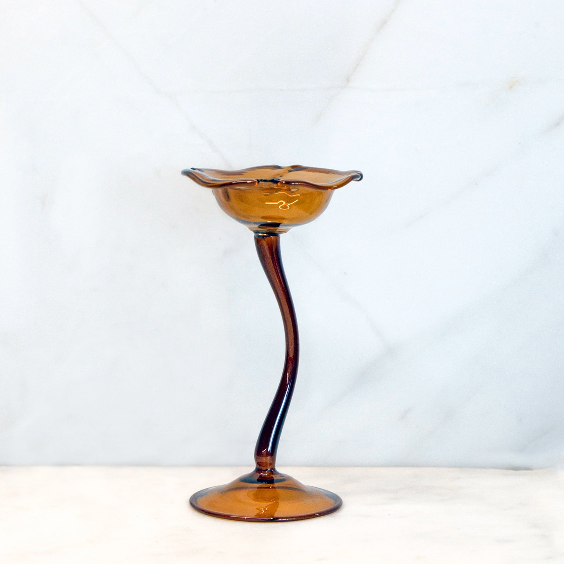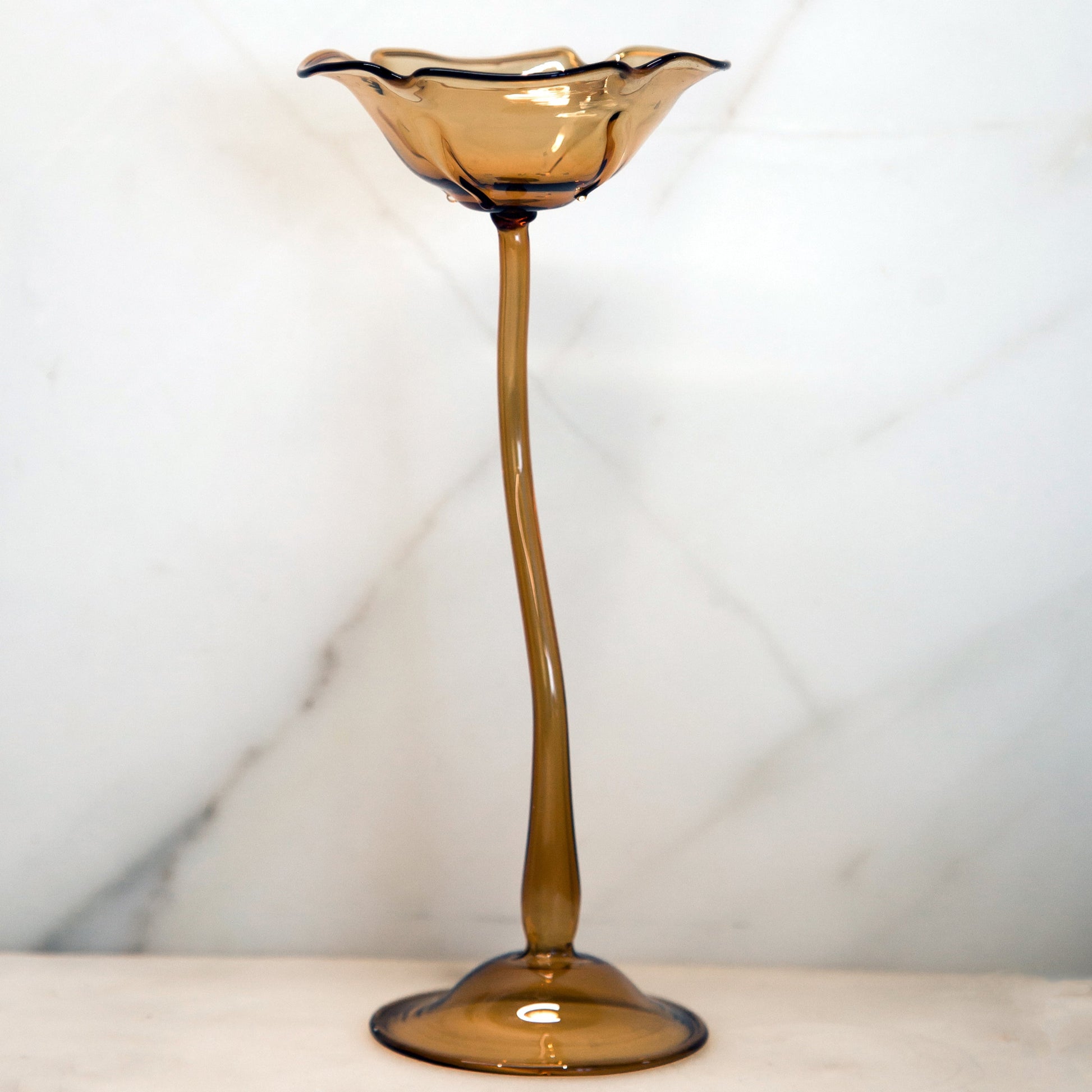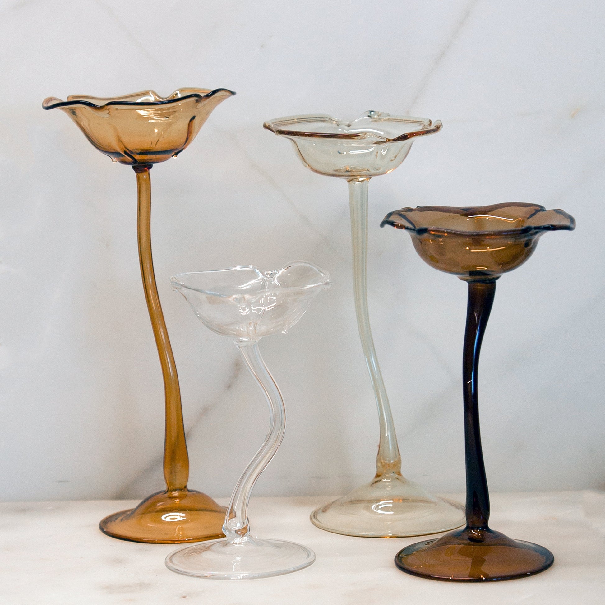 Elegantes piezas de vidrio soplado hechas a mano, diseñadas para usarse como candelabro o apagavelas. Su forma orgánica tipo flor y sus tonos cálidos las convierten en un detalle único para decorar o regalar.