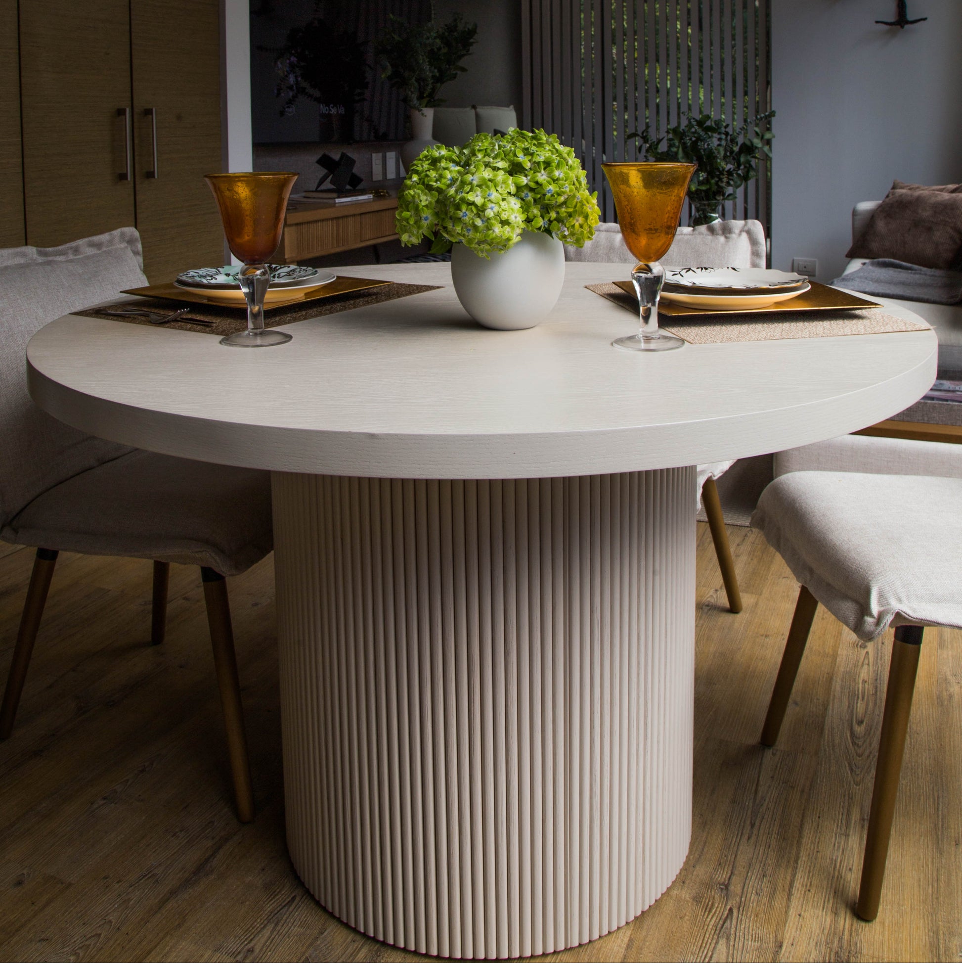 El soporte central de la mesa tiene un diseño en forma de cilindro con texturas verticales, lo que le añade un elemento decorativo único y elegante. Este detalle crea un contraste interesante con la superficie lisa del tablero, aportando dinamismo visual sin sobrecargar el diseño.