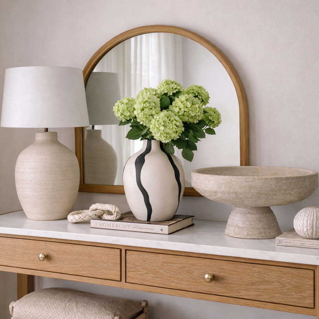 Con un diseño minimalista y un trazo negro que fluye como corriente sobre su superficie, esta vasija artesanal combina fuerza y sutileza. Cada línea es única, evocando el movimiento natural del agua. Hecha a mano en Colombia.